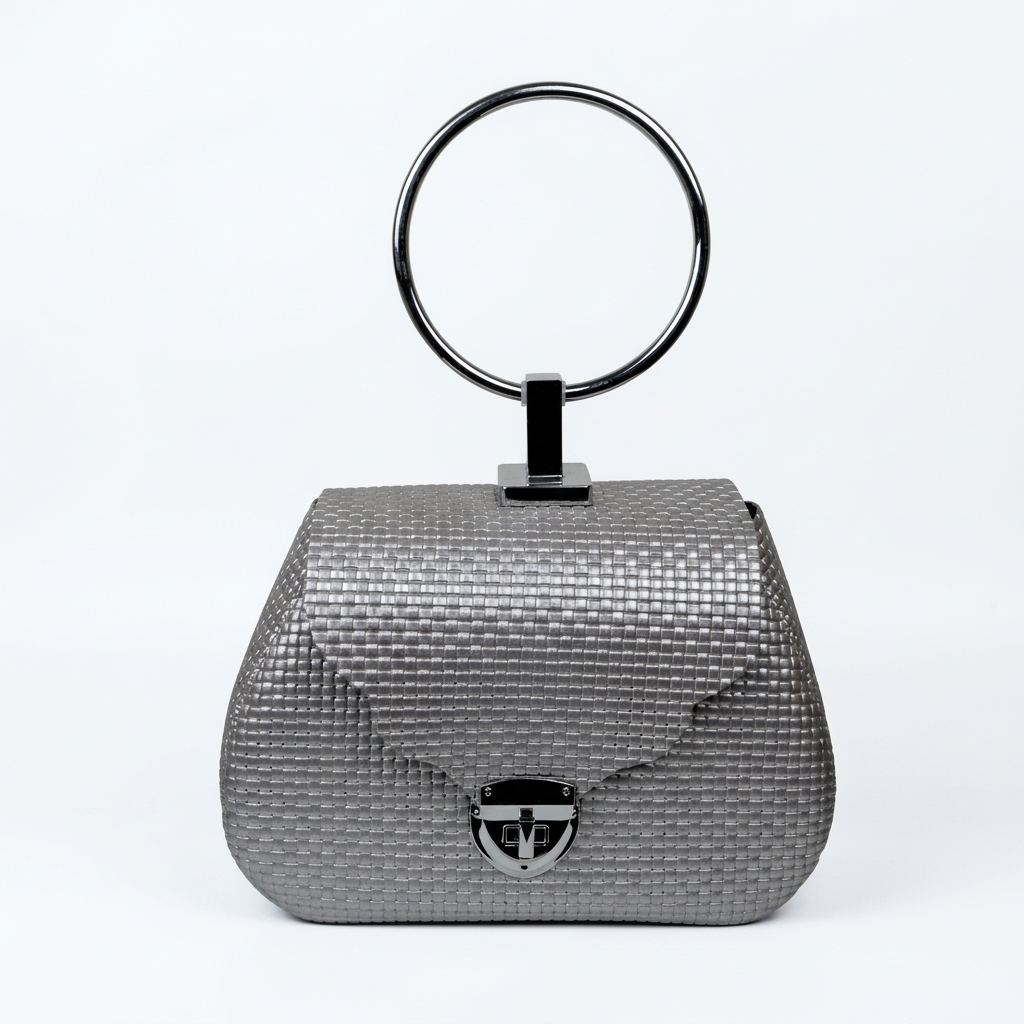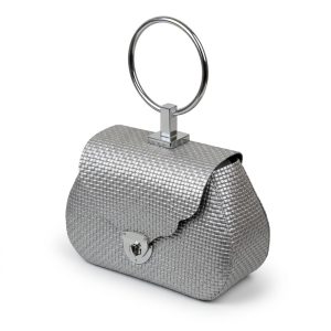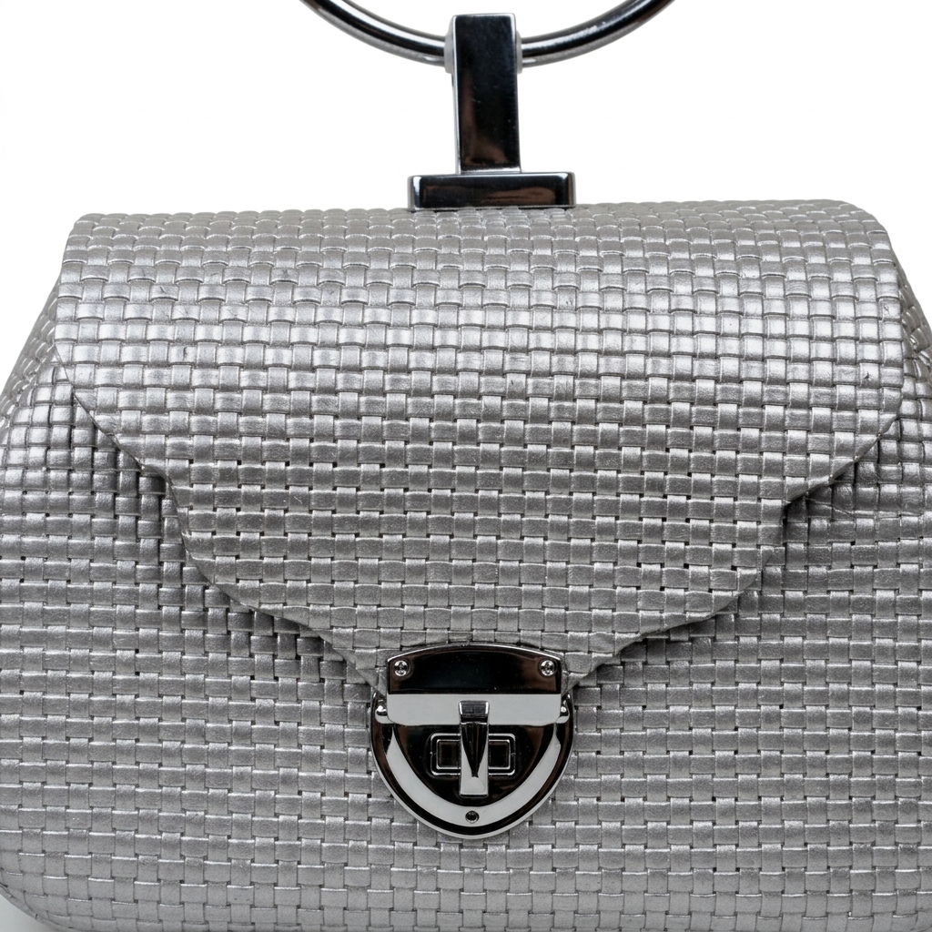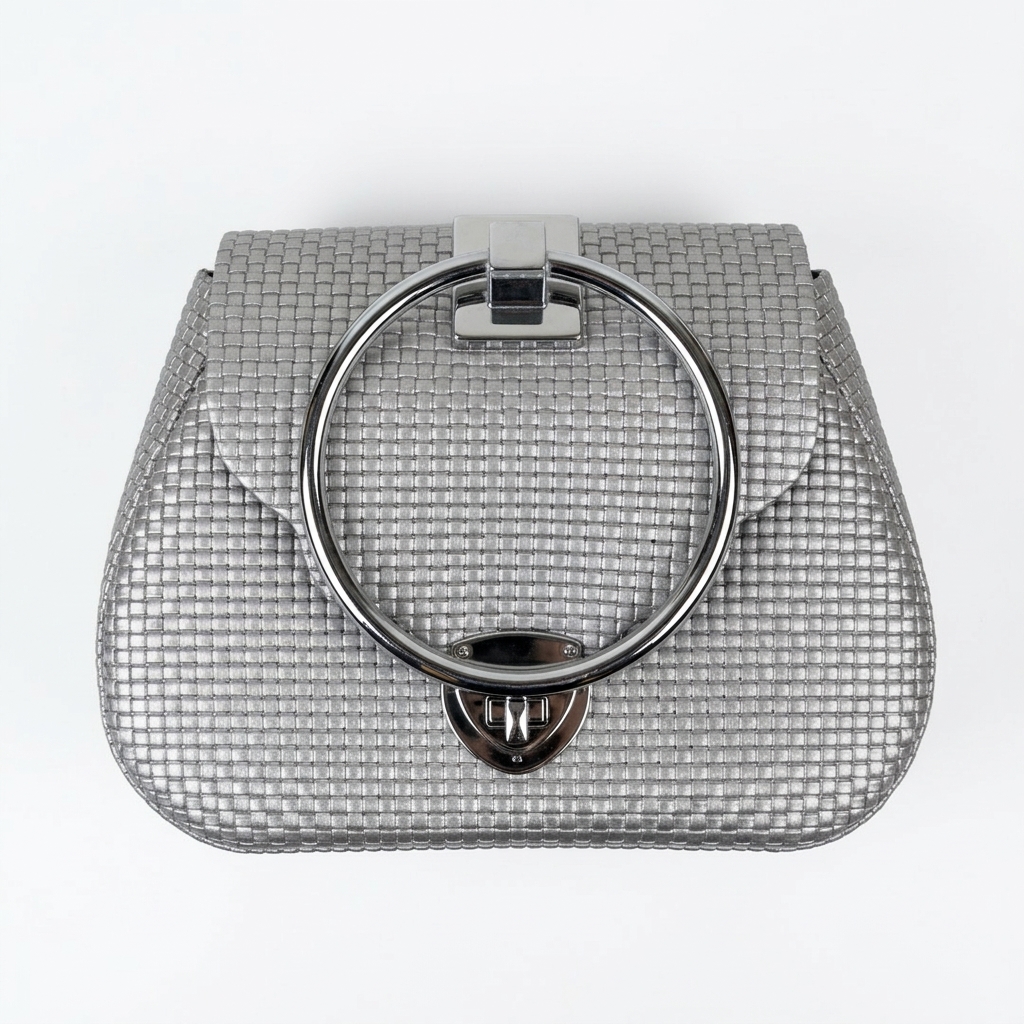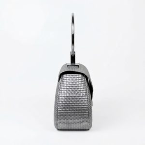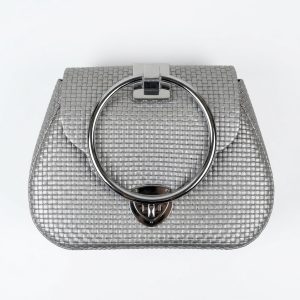 Elegantly designed and compact, this handbag exudes sophistication that captivates at first sight, with intricate details that require more than just a glance to fully appreciate. Crafted from high-quality natural leather, meticulously embossed and dyed in a stylish silver hue. The bag’s accessories match in elegance and quality with their rust-resistant silver color. The handbag’s handle is in the shape of a perfect circle and secures with a metal lock.”